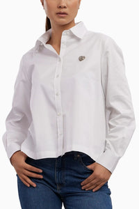 Elevate your wardrobe with this elegant crop shirt, crafted from ultra-soft Pima cotton. The relaxed-fit crop shirt features a classic collar, full sleeves, and a stunning Swarovski pearl heart embellishment for a touch of glamour.