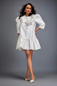 A dramatic design featuring ruffled puffed sleeves and a voluminous skirt, embellished with intricate black Swarovski-beaded floral applique detailing.