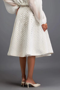 A midi-length A-line skirt with 3D textured detailing and a distinctive grid pattern, offering a sophisticated and modern silhouette with a touch of dynamic texture.