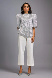 A textured silver shimmer top with sculptural shoulder accents, paired with tailored white cropped pants. This sophisticated co-ord set offers a fresh and contemporary style, perfect for chic events.