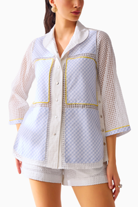 Introducing the Tulum White Nylon and Cotton Dobby Shirt, a stylish blend of comfort and flair. This button-down shirt features a playful blue checks patchwork highlighted with vibrant yellow piping. With a statement collar and snap buttons on the bottom sides, it adds a unique touch to your look. Designed with no lining in the front and a lined back, this relaxed-fit shirt is perfect for effortless layering and everyday wear.