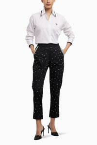 Refined with a modern twist, the White Tuxedo Small Swarovski Heart Shirt features a relaxed boyfriend fit, two-tone classic collar, and black-trimmed full sleeves. Embellished with a delicate pearl Swarovski heart, it’s paired with coordinated Swarovski-embellished pants for a sleek, sophisticated ensemble.
