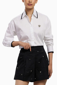 Smart meets sparkle in the White Tuxedo Small Swarovski Heart Shirt, designed in a relaxed boyfriend fit with a two-tone classic collar and black-trimmed full sleeves. A pearl Swarovski heart adds a touch of elegance, perfectly paired with matching Swarovski-embellished shorts for a polished yet playful look.