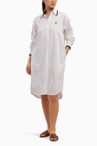 Timeless and elegant, the White Tuxedo Shirt Dress offers a relaxed fit with a refined two-tone classic collar trimmed in black. Full sleeves echo the sleek black detailing, while a pearl Swarovski heart embellishment adds a delicate touch of luxury.