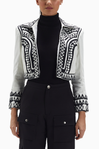 Elevate your look with our White Twill Black Thread Work Crop Jacket. Made from quality twill fabric, this jacket boasts a clean and sophisticated design for a versatile, chic wardrobe addition.