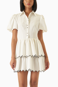 This super-elegant and classy Cotton-Silk A-Line Mini features a button up style bodice in a twin-button pair placket with exaggerated balloon sleeves and tiered skirting panels. Finished with Edgy & Sharp scalloping at the hem in contrast thread detailing!