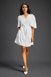 Featuring a white v-neck playsuit with puff sleeves and a flared hem, this elegant piece is elevated by a sheer back adorned with delicate 3D florals and glossy leaf embellishments for a soft, romantic touch.