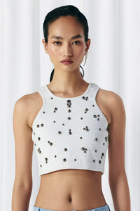 Bold yet effortless, this ribbed cropped tank shines with stud embellishments, offering a perfect balance of edge and comfort.