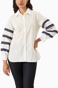 Featuring the Grace Shirt by Trisara, this elegant white cotton shirt is adorned with delicate navy blue lace bead detailing. Designed in a straight fit, it effortlessly blends refined charm and intricate craftsmanship for a timeless, sophisticated look.