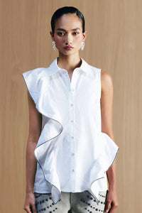 Designed with asymmetric frills and edgy zipper detailing, this shirt adds a unique flair to any look.