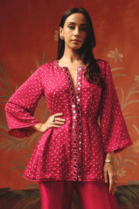 Featuring a Gajji Bandhani V-neck peplum top adorned with intricate mirrorwork and delicate beadwork, this piece blends traditional charm with a flattering, contemporary silhouette.
