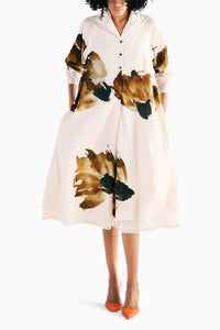 This off-white floral art print mul dress features lapel collars, a front button opening, and raglan sleeves, offering a relaxed yet structured look. The back pleat detailing adds a touch of elegance. Inside, the dress is lined with a playful polka dot mul fabric, complemented by delicate lace detailing for a refined finish. For added convenience, it includes side seam pockets, blending style and practicality effortlessly.