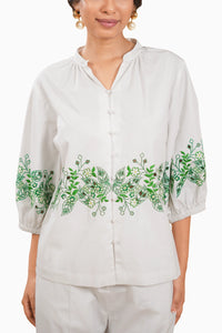 Blending soft femininity with intricate craftsmanship, this embroidered cutwork blouse draws inspiration from delicate lacework. Beautiful beaded buttons, gathers at the front neck makes it perfect summer wear favourite.