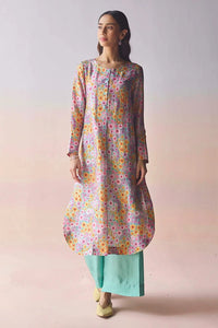 Handspun in Malda silk, the kurta features a delicate all-over hand-painted floral print, with a center-front button opening that adds both detail and ease. Buttoned cuffs and a rounded hem lend refinement to its relaxed fit, while wide-bottom pants complete the set with graceful fluidity.