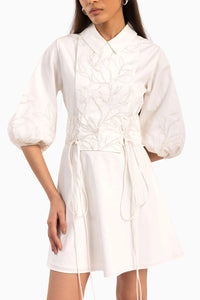 This short dress, featuring a shirt collar and a belt around the waist, has a form-fitting silhouette with adjustable drawstrings like in a corset . Concealed zip closure.