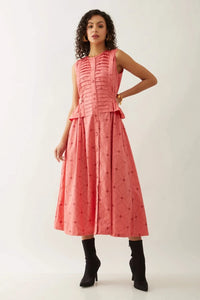 Willow Dress in Salmon with Regal Print, A sleek sleeveless silhouette with a closed round neckline for a refined appeal. Intricate horizontal pleats contrast with vertically aligned stripes, creating a striking interplay of textures. The concealed front placket ensures a seamless finish, while the gathered side, fastened with buttons, adds a touch of movement and dimension. Style it with delicate jewelry effortlessly chic daytime look, or pair it with bold accessories for an elevated evening ensemble.