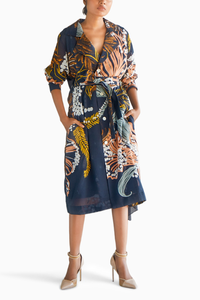 A classic BENNCH Trench with a special twist like always. Double breasted collared trench with our Window Leaf Print all over. An asymmetrical black scarf panel at the back yolk for that graceful movement. Has side pockets, belt, long cuffed sleeves.