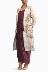 A modern pairing of softness and structure.This coordinated set brings together a fluid wine Chanderi dress and a sheer white-gold trench — a balance of quiet opulence and contemporary form.