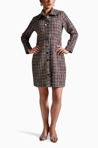 Wine red tweed dress, With front button opening, Soft collar with fringe detailing, Pockets on both sides. Can be styled as a long coat by adding layers underneath