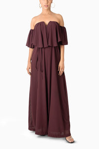 Featuring Wine Prague Jumpsuit by Kiran Gupta Label. An off-shoulder ruffle layer palazzo fit jumpsuit in Korean double georgette. It comes with lining, side pockets, additional tie-up belt to add shape as required.