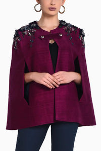 This Wine Color Raw Silk Cape is a luxurious and striking piece, featuring intricate handwork with 3D floral embroidery. The rich, deep wine hue of the raw silk adds sophistication, while the delicate, textured 3D flowers enhance the overall design with a touch of artistic elegance. Perfect for special occasions or evening events, this cape offers both warmth and style, combining modern craftsmanship with timeless beauty.