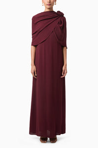 The Rosette Draped Shoulder Gown brings a sculptural, contemporary elegance to evening dressing. Cut in a fluid, floor-length silhouette, the design features an asymmetric draped overlay that sweeps across the bodice and secures at the shoulder with discreet snap fastenings, creating a soft yet architectural shape.
