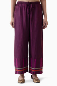 Zen pyjama in dark wine silk cotton satin, featuring a hem finished with light wine and dusty orange patti. Intricate cutdana work enhances the detailing, adding texture and striking color contrast.