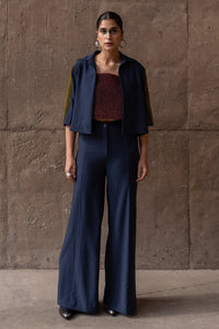 Featuring the Winged Crystal Blue Top with Bottom and Jacket by Somya Goyal's Comfort Zone Collection, this co-ord set brings together three signature pieces: a short jacket with hand-textured recycled PVC cord sleeve detailing and a relaxed elbow-length fit; a fitted navy blue crop top with pink hand-looped recycled PVC embroidery, square neckline, and zipped side; and high-waisted space blue flared trousers crafted with a 95% viscose blend and 5% spandex, complete with front seams and waistband cut-out pockets. Together, this ensemble offers a bold yet comfortable blend of artistic design, structure, and functionality.