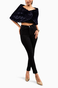 A cropped faux-fur wrap in deep navy or black, featuring textured horizontal or chevron ribbing. Designed to drape off the shoulders and highlight the neckline, it adds luxurious, glamorous flair—an elegant cover-up for gowns, cocktail dresses, or refined evening looks.