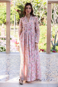 The Woodsong dress, in handwoven fine silk khadi, carries a hand-painted print of wild blooms and woodland secrets. A shawl collar frames the neckline, while the gathered waist and full sleeves add movement to its serene elegance. A maxi dress that feels like a quiet walk through nature's embrace. The dress comes with a cotton silk slip.