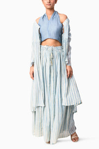 Elevate your everyday style with this elegant hand block printed tie-up tunic, paired with matching printed pants and a solid bralette for a soft, balanced contrast. Crafted in breathable Chanderi with lining for all-day comfort and effortless charm.