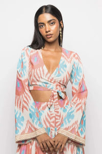 This elegant yet effortless piece features a flattering wrap design that cinches at the waist, offering a customizable fit. The tie detail adds a playful touch, making it both stylish and versatile for any occasion. With a plunge V-neck, cropped length, and bell sleeves, it blends sophistication with ease, perfect for dressing up or down with a touch of flair.