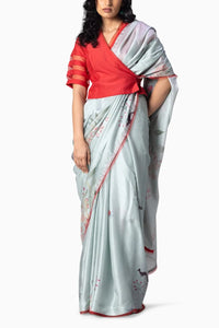 Wren Saree, printed on silk kota, adored with a red organza badwah border and red voile facing, finished with a haze blue shantoon fall for a delicate touch.