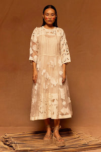 The Yamada Patchwork Dress is a true celebration of craftsmanship, evoking the tranquil beauty of vast mountain fields. Thoughtfully constructed, it features a mesmerizing interplay of contrasting panels adorned with intricate applique, delicate cutwork embroidery, and fine shell tucks. The loose, flowing silhouette drapes effortlessly, offering a perfect balance of comfort and elegance.