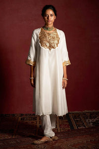 The Yashoda Pearl Kurta is tailored in the finest pure silk in a clean, straight silhouette. The kurta features a bodice of metal gota, cut in a pattern inspired by Mughal arches and the sleeves feature a similar border to match. The hemline of the kurta is cut into our signature arches and finished with embroidery. The kurta comes with a matching churidaar in pure silk.
