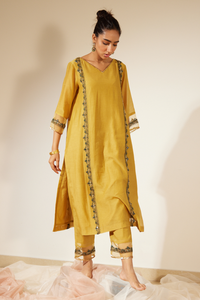 Featuring Yellow Abir Kurta Set by Sarang Kaur from Gulaal Collection. This mesmerizing ensemble of a yellow embroidered kurta paired with matching pants in chanderi base. Elevating its allure with its shimmering texture and exquisite detailing.
