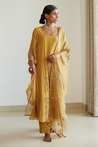 Featuring Yellow Akaari Stole by Sarang Kaur by Akaari Collection. Crafted by luxurious organza silk in a vibrant yellow hue, this stole embodies elegance and charm. Perfect for adding a touch of sophistication to any outfit, ideal for both formal and casual occasions.