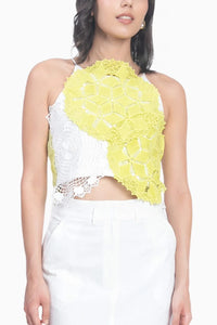Featuring a halter-neck silhouette, this crop top is crafted in contrasting chemical lace with bold circular motifs that add sculptural dimension. Designed in a slim fit with a round neckline and a concealed side zip, it offers a smooth, contoured finish with striking visual texture.