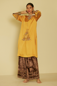 Featuring Yellow Arya Kurta Set by Sarang Kaur by Meera Collection. This ensemble features a satin silk kurta paired with velvet pants in a radiant yellow hue. Perfect for special occasions, it blends luxurious comfort with elegant design, epitomizing Sarang Kaur's distinctive craftsmanship.