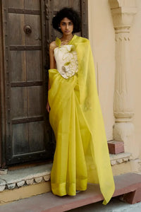 Featuring Yellow Beige Anaya Corset Saree by Ritika Arya Jain's RAYA collection, this ensemble blends a corseted silhouette with airy sunlit yellow drapes, exuding grace and power, while delicate wired blossoms add a whimsical, poetic touch.
