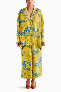 Featuring an oversized blazer looking shirt with fitted at the waist pants. Its digitally printed with embroidered lapels.