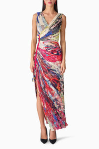 Featuring Yellow Blue Prime Anya Dress by Saaksha & Kinni's Nirah Collection. This abstract floral print dress showcases a surplice bodice, hand micro pleats, and intricate mirror and tassel embroidery with adjustable side drawstring detailing for a unique and elegant silhouette.