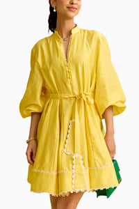 Featuring Yellow Chanderi Short Dress by Ridhi Mehra from Love Rosetta Collection. This yellow chanderi short dress adorns delicate lace detailing, offering a vibrant yet elegant look. Perfect for any occasion, it combines the luxurious feel of chanderi with charming, intricate lace accents.