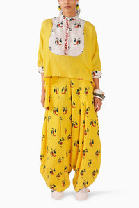 Featuring a breezy silhouette, this Yellow Cheesecloth Kaftan Top from the Chilli collection showcases a cream chilly print yoke and comes paired with matching chilly print pants, effortlessly blending comfort with playful charm.