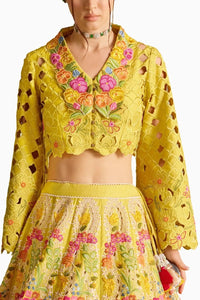 Featuring yellow chanderi tonal cutwork, beadwork bolero jacket.