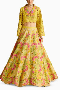 Featuring yellow chanderi tonal cutwork, beadwork bolero jacket paired withyellow chanderi multi-floral threadwork, beadwork and cutwork lehenga .