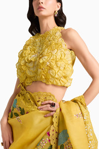 Embracing the essence of summer sunshine with a yellow Shaded Dahlia 3D appliqué top by Chandrima's Florens collection. Crafted from a luxurious Chanderi fabric, renowned for its lightweight feel and subtle sheen, this top exudes elegance and charm.