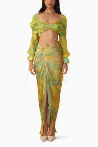 Featuring the Yellow Daisy Kanissa Blouse with Gigi Skirt by Saaksha & Kinni's Akara Collection A/W'25. The wide-neck blouse has bandeau detailing in abstract micro pleats, paired with a floral asymmetric pleated skirt with zip- balancing texture and structure.