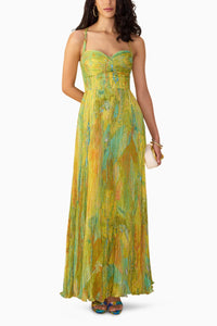 Featuring the Yellow Daisy Kiara Dress by Saaksha & Kinni's Akara Collection A/W'25. A hand micro-pleated maxi dress in abstract floral print, designed with adjustable straps for a flattering fit that moves with elegance.