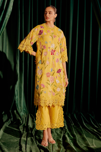 Introducing our vibrant yellow silk organza kurta, adorned with beautiful multicolor floral appliqué and intricate beadwork. This stunning piece is paired with yellow Chanderi tonal cutwork pants featuring chic slit details, creating a stylish and contemporary ensemble. Perfect for festive occasions or special gatherings, this outfit combines elegance and playful charm.
